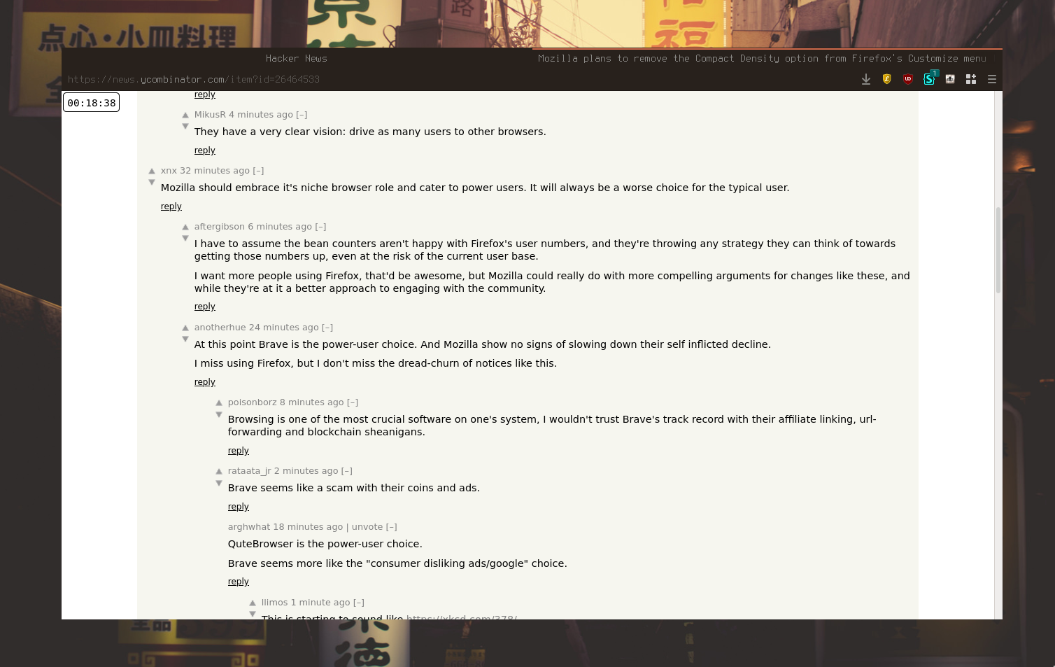 Seems like every time I see coverage about Firefox, it's Mozilla removing or crippling some feature I care about.